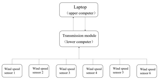 The wind field sampling line was parallel to the droplet sampling line and perpendicular to the UAV flight path. Six wind speed sampling points were symmetrically distributed along the UAV flight path. The measurement points were marked as −3.6, −2.1, −0.6, 0.6, 2.1, and 3.6 m from left to right. The field layout of the WWSSNMS nodes referred to the three-dimensional three-way linear gust wind field measurement method proposed by Hu et al. [25]. Each measurement node was equipped with three wind speed sensors to measure the direction parallel to the route (X-direction), horizontal and perpendicular to the route direction (Y-direction), and the wind speed perpendicular to the ground (Z-direction).