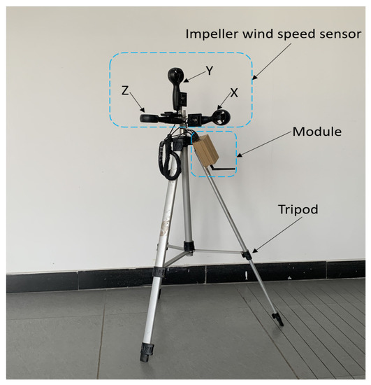 As shown in Figure 2, the wireless wind speed sensor network measurement system (WWSSNMS) for UAV (Guangzhou Fumin measurement and Control Technology Co., Ltd., Guangzhou, China) was used in this spray test, which includes impeller-type wind speed sensors (Figure 3) and wind speed sensor wireless measurement nodes. The impeller wind speed sensors measure the three-dimensional wind speed generated by the UAV flying. The measurement range of the system is 0~45 m/s, the measurement accuracy is ±3%, and the measurement resolution is 0.1 m/s. The wind speed sensor wireless measurement node is composed of a 490 MHz wireless data transmission module, a microcontroller, and a power supply module to realize the transmission of wind speed data to the Laptop. The working principle is shown in Figure 2. The single sampling time of the system is 5 s, the sampling frequency is 20 Hz, and the continuous working time of normal field work is 10 h.