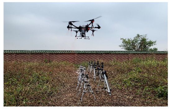 The UAV used in this spray test was a DJI T16 six-rotor electric UAV for plant protection (Shenzhen DJI Technology Co., Ltd., Shenzhen, China), as shown in Figure 1. The spraying system of the UAV is composed of hydraulic nozzles, pressure pump, tank, etc. The number of nozzles is eight, and two nozzles are used as a group to be symmetrically distributed under the rotors on both sides of the fuselage. The UAV model has the functions of route planning and autonomous obstacle avoidance, which can complete aerial spraying operation autonomously, and its main performance indicators are shown in Table 1. The nozzle type selected in this test is Teejet XR11001VS. When the UAV is spraying, the four nozzles behind the fuselage are turned on for spraying. The maximum flow rate of the spraying system can reach 4.8 L/min, and the spraying flow rate can be adjusted by the handheld ground station. In addition, when the flight height is 1.5~3.0 m, the range of the effective spray width is 4.0~7.5 m.