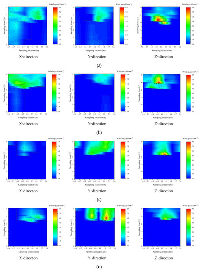 The wind speed distribution map is shown in Figure 6, and can directly reflect the downwash wind field distribution at different flight heights. As shown in Figure 6a, the downwash wind field in Z-direction had two airflow centers at the acquisition position of ±0.7 m, which were symmetrically distributed along the center route when the flight height was 1.0 m. The distance between the centers of two airflows was about 1.5 m, which roughly corresponds to the distance between the centers of rotors on both sides of the UAV. The peak value of wind speed in the airflow center can reach 8.1 m/s, and the wind speed directly below the fuselage center was significantly lower than that on both sides. It also showed that the downwash wind field below the fuselage was concentrated in the coverage range (–1.5~1.0 m) directly below the rotor. The main downwash wind field in Y-direction was concentrated below the fuselage, and it was mainly distributed at the lower right of the fuselage with the peak wind speed of 4.2 m/s. This may be mainly due to the low flight height of UAV, resulting in insufficient space for the downwash wind field on both sides of the rotor to spread out fully. Different from the downwash wind field in Z-direction and Y-direction, the distribution of the downwash wind field in X-direction was relatively scattered, and did not form a large continuous airflow central area, but it covered a wider area. Moreover, there were some concentrated area of wind speed in X-direction at the collection positions of −2.0, −0.6, and 2.0 m, and the wind speed value was 3.8 m/s.
