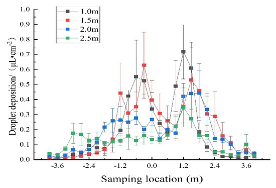 Similarly, it can be seen that the CV of droplet deposition in the effective spray area were 58.3%, 62.0%, 48.6%, and 42.5% at altitudes of 1, 1.5, 2, and 2.5 m. The higher the flight height, the better the uniformity of droplet deposition. Combined with the analysis of the downwash wind field of UAV, it was mainly caused by the influence of the downwash wind field in Y-direction and Z-direction on droplet deposition distribution. When the flight height was low (1.0 and 1.5 m), the downwash wind field in Y-direction was weak, and the downwash wind field in Z-direction was strong and had two strong airflow central areas below the fuselage. The distribution of the downwash wind field was not conducive to the diffusion of droplets to both sides, so the droplet deposition under the airflow central area was significantly higher than that in other places, resulting in poor uniformity of droplet deposition. When the flight height of the UAV became higher (2.0 and 2.5 m), the downwash wind field in Y-direction was enhanced, while the downwash wind field in Z-direction was connected to form a whole airflow field. In this case, the distribution of the downwash wind field was more uniform, so the droplets were deposited more uniformly under the action of the wind field.