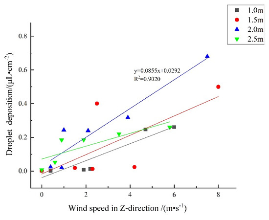According to the analysis of the test results, the appropriate flight height should be set when UAV was used for aerial spraying in the field, not too high or too low. When the flight height is too high, the downwash wind field above the crop canopy will be weakened. The weakened wind field in the vertical direction would cause a sharp decrease in the amounts of droplets deposited on the crop canopy, and the increase of the horizontal wind field will aggravate droplet drift to the non-target area. When the flight height is too low, the strong downwash wind field in the vertical direction above the crop canopy will result in poor uniformity of droplet deposition, which cannot achieve the ideal control effect, such as the re-spray and missed spray [16,28]. Therefore, the downwash wind field in the vertical (Z) direction is regarded as the most important analysis factor affecting droplet deposition. It can be seen from the regression model that the regression coefficient of the model increased with the increase of flight height, indicating that the promoting effect of the wind field in Z-direction on droplet deposition is also increasing with the increase of flight height. However, when the flight height increased to 2.5 m, the regression coefficient of the model decreased sharply (Figure 8), which indicated that the promotion effect of the wind field in Z-direction on droplet deposition was also weakened. At the same time, when the flight height was 2.0 m, the fitting degree of the regression model between the wind field in Z-direction and the droplet deposition was the best, and its R2 reached 0.9020. Therefore, according to the test results, the optimal flight height of the DJI T16 plant protection UAV was 2.0 m without the influence of the external environment conditions.