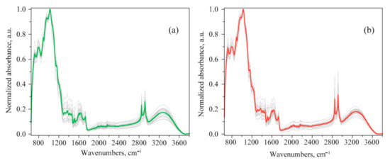 Normalized FTIR absorbance spectra of 20 healthy (a) and 20 infected (b) grains (grey). The averaged spectra are colored with green and red respectively.