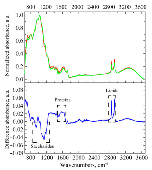 It can be noted that the weights for the loading of the PC1 correlates with the difference IR absorption spectrum shown in the bottom of Figure 2. So, in particular, the highest weights were noted in the range of 1210–1680 cm−1 where the protein media absorption is also located. Significant weights are also observed in the stretching CH2 vibrations near 2848 and 2916 cm−1 associated with lipids. At the same time, the weights for the region near 1100 cm−1, which is characteristic for the bands with the highest absorption in saccharides, have the opposite sign compared to aforementioned peaks.