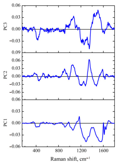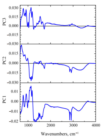 The PCA was performed in the 650–4000 cm−1 region. At the same time, special attention was paid to the region of 650–1800 cm−1, where the prominent peaks for saccharides and proteins are located. The calculated eigenvalues ranked in descending order and percentage variance explained depending on the PC number are presented in Figure S1. The first 3 PCs were chosen to explain slightly more than 90% of variance. At the same time, the first two main components account for approximately 81.9%. Figure 3 shows the loadings for the first three principal components.