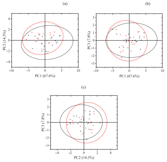 PCA scores graphs: (a)—PC1-PC2, (b)—PC1-PC3 and (c)—PC2-PC3. The black color is used for the healthy scores and red color is used for infected and their 95% probability ellipsoids with the corresponding color.