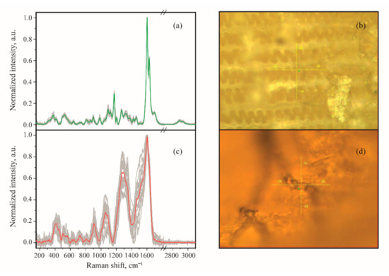 The difference in Raman spectra of healthy and infected grains occurs due to two main reasons. The first one comprises from the fact that fungi grows on the outer husk surface, which results in lower Raman signal from the grain husk. Another reason is connected with the peaks broadening associated with structural disordering or chemical transformation. The husk peaks broadening could be obviously observed by Figure 5a,c in the 350–600 and 1565–1670 cm−1 region comparing.