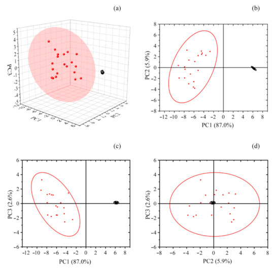 Scores graphs for first 3 PCs (a), PC1-PC2 (b), PC1-PC3 (c), and PC2-PC3 (d) and their 95% probability ellipsoids. The black color is used for the healthy score and red color is used for infected.