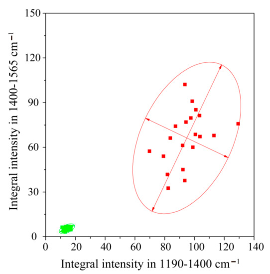 First approach is based on the integral intensities comparison in the two following regions: 1190–1400 cm−1 and 1400–1565 cm−1, where the significant variance concerning the qualitative and quantitative changes between healthy and infected samples was noticed. According to the Table 4 the integral intensities in these regions possess significantly different mean values, standard deviations and other properties. Therefore, the healthy and infected samples are effectively separated in two classes. The separation is demonstrated in Figure 8 along with 95% probability ellipsoids. In both regions a significant contribution of various bending vibrations of different origin are observed in spectra. This contribution arises mainly from carbohydrates which predominantly form oat husk for healthy samples. On the contrary, the significant contributions from the lipids and protein media in the 1190–1400 cm−1 and 1400–1565 cm−1 region is clearly seen for infected samples.