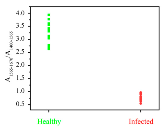 However, in Figure 6 all three PC loadings in the 1565–1670 cm−1 region have low weights. This information could be used as an another approach for the grain characterization on the basis of integral intensities ratio A(1565–1670)/A(1400–1565), where A(1565–1670)—integral intensity in 1565–1670 cm−1 and A(1400–1565)—integral intensity in 1400–1565 cm−1. This ratio was chosen due to the fact that the integral intensity in the region 1190–1400 cm−1 is greater than in 1400–1565 cm−1 see Table 4. This leads to greater separation of results obtained for two classes (infected and healthy samples). Figure 9 shows two obtained datasets for A(1565–1670)/A(1400–1565) ratios for infected and healthy grains. These two datasets were tested with t-test and it was obtained that statistically significance for the two groups with a p-value is much lower than 0.05. Moreover, the difference between two data sets means (about 2.42) lying between 2.24 and 2.61 was calculated with the 95% confidence. Also, the T2 Hotteling test (F-distribution and χ2 approximation) have shown statistically significance for the two groups with a p-value much lower than 0.05.