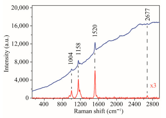 To reveal the additional characteristic features, which may be used as a marker in disease detection, the investigation of infected areas by 532 nm laser was performed. This approach allowed obtaining resonance Raman spectra of fungi pigment. The Raman spectrum from Figure 10, obtained from the infected area, demonstrates a set of peaks typical for carotenoids. The peaks at 1004 cm−1, 1158 cm−1, and 1520 cm−1 belong to the first order Raman scattering, whereas peak 2677 cm−1 is attributed to the second order. The first order Raman peaks are assigned for C-CH3 rocking mode (1004 cm−1), stretching C-C vibrations coupled with bending in plane C-H vibrations (1158 cm−1) and C=C stretching vibrations in conjugated chain (1520 cm−1) [61,62]. The second order peak at 2677 cm−1 is considered as the sum of 1004 cm−1 and 1158 cm−1. The 532 nm laser excitation wavelength is close to the S0 (11Ag) → S2 (11Bu) electronic transition in the carotenoids resulting in the intense signal of the first and second order Raman scattering in infected grains [63,64]. The similar spectrum was not observed for the healthy grains. Under certain conditions some of the Fusarium fungi can produce the pigments belonging to the carotenoids class, which is described in [34,65,66,67,68]. The demonstrated capability of intense carotenoids Raman signal detection from the grain surface can be potentially used as an additional marker for the fungi disease detection.