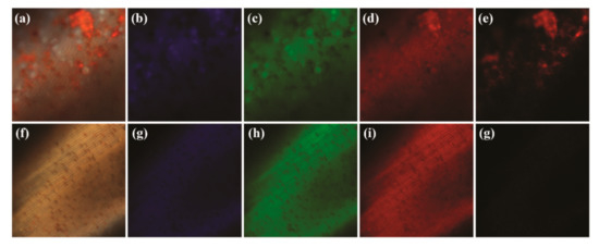 At the first stage, all four lasers (405 nm, 488 nm, 561 nm, 638 nm) simultaneously excited the emission in order to determine the greater luminescence contrast between healthy and infected areas. The healthy grains emission demonstrates the homogeneous behavior in the whole spectral region without any additional luminescence centers. On the contrary the infected grains emission spectra possess several spectral features. As it can be clearly seen in Figure 11, the most intense luminescence contrast was observed in the region 663–738 nm (see Figure 11e,g).