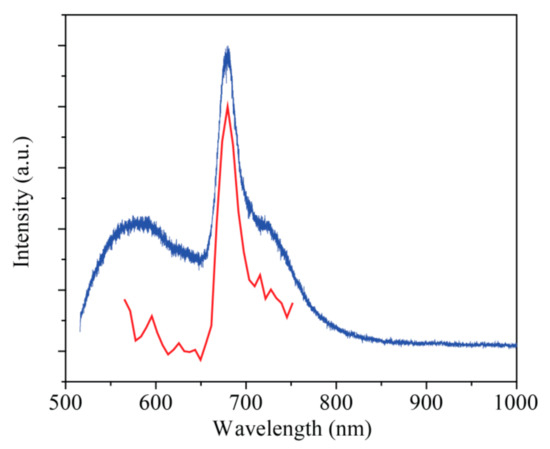 The presence of this luminescence peak from infected grains was also confirmed using 514.5 nm Ar+ laser excitation by LabRam HR800 Raman spectrometer (Figure 12 blue line). Moreover, the second peak near 730 nm under 514.5 nm excitation was also identified as a shoulder on the long-wave side of 680 nm peak. Both spectra from luminescence microscope and Raman spectrometer are presented in Figure 12. The identified peaks were attributed to chlorophyll α luminescence [69,70]. Its presence in the infected grains may occur due to infection process during plant flowering period.