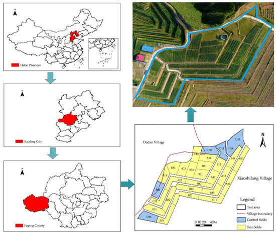 In 2015, Fuping County, Hebei Province, China, was established as a pilot county for the development and utilization of unused land resources suitable for farming. The county develops and organizes damaged construction land and unused land with a slope of less than 25 degrees into cultivated land, and helps farmers to overcome poverty through improvement and development of barren hills and unused land. The study area (Figure 1) was located in Xiaoshifang Village, Fuping Town, in the middle and south of Fuping County. The coordinates are 114°15′11″–114°16′41″ east longitude, 38°48′26″–38°47′ north latitude 3″. It is a low mountain and hilly area with an altitude of 300–350 m; the average annual temperature is 12.6 °C and the accumulated temperature is 801.9 °C. The average annual rainfall is 550 mm, 80% of which occurs between June and August. The mountain is windy every afternoon and the frost-free period is 140–190 days. The soil is ochrepts, according to Soil Taxonomy. Weathering, gneiss movement, and nutrients and organic matter contents were regarded as the dominant limiting factors affecting agricultural production in the area.