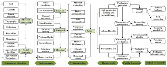 The cultivated land system is a natural geo-socio-economic complex composed of climate, soil, parent material, topography, hydrology, vegetation, and human activities [45]. The quality of the cultivated land is based on the many functions performed by cultivated land elements, and the operation of cultivated land systems requires various physical, chemical, and biological processes [46]. For example, the water cycle and thermal movement can promote the absorption and utilization of water and nutrients by crops; biological processes, including humification, nutrient cycling, and photosynthesis, increase the nutrient levels required for crop growth and fix carbon dioxide to release oxygen; and chemical processes, which include ion exchange, acid-base reactions, and redox reactions, affect soil stability and fertility. These processes all affect nutrient availability and contribute to the movement of substances in the soil [47]. The cultivated land system also carries out many functions that are closely related to human life, such as material production, water conservation, soil conservation, and carbon retention [48,49]. Objectively, the functions of cultivated land are subjugated to the needs of human beings at different levels, which suggests that in the initial stage of socio-economic development, the primary requirement of cultivated land is to guarantee high-yields and efficient food production [50].