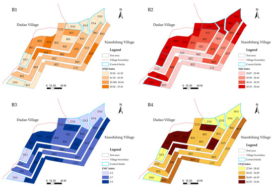 B1 is the map of the distribution of the soil fertility quality indexes for the different experimental treatments; B2 is the map of the distribution of the engineering quality indexes for the different experimental treatments; B3 is the map of the distribution of the ecological quality indexes for the different experimental treatments; B4 is the map of the distribution of the cropland quality indexes for the different experimental treatments.