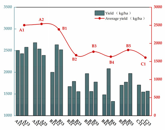 The average yield for each field was obtained by taking an average of the yields from the three plots in each field. The value was then converted into the millet yield per hectare. The average millet yields for the three replicates were used to obtain the millet yields for the eight test treatments. Figure 5 shows that the millet yield ranking after each experimental treatment was A2 > A1 > B1 > B5 > B3 > B2 > B4. The A1 and A2 yields were higher than those of the other groups, and the A2 yield was the highest at 2538.46 kg/ha. The yields increased significantly compared to the control group (C1), with an average increase of 57.96%. The B1, B2, B3, B4, and B5 crop yields were higher than C1. The B1 treatment showed the highest increase in output among the B treatments at 48.51%, B4 had the lowest increase in output, at 1.59%, and B2, B3, and B5, whose percentage increases were 4.07%, 10.09%, and 13.08%, respectively, showed no significant difference in output.