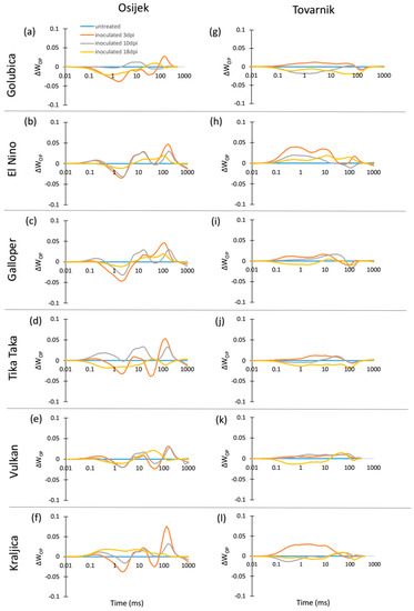 The chlorophyll a fluorescence (ChlF) transients of the dark-adapted ears at three measurement points had the expected OJIP shape for all untreated control plants as well as for FHB inoculated plants of all six winter wheat varieties at both experimental locations (Osijek and Tovarnik), demonstrating that all measured ears were photosynthetically active (data not shown). Differences in average variable fast fluorescence transients between O and P steps in ears are presented as difference kinetics ΔWOP (Figure 4). Similarly, as in flag leaves, changes occurring in the O–J and O–I phase between inoculated and untreated plants were considerably affected by location. Generally, a strong J-peak and I-peak were not visible for the majority of varieties regardless of measurement time, although more considerable differences were observed between inoculated and untreated plants of variety El Nino (Figure 4h), Vulkan (Figure 4k), and Kraljica (Figure 4l) at location Tovarnik.