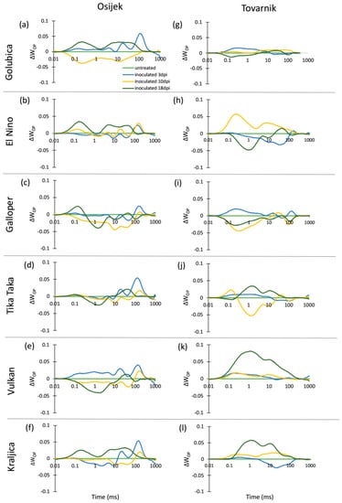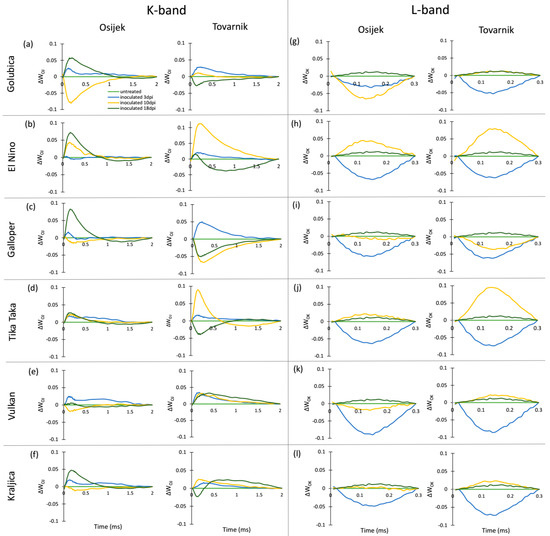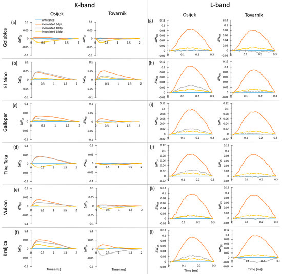 The occurrence of K-bands and L-bands in flag leaves after FHB inoculation is presented at Figure 2. For variety Golubica, only small differences in K-band are induced by FHB at both locations (Figure 2a), while El Nino showed a positive K-band, especially in earlier phases of infection (Figure 1b). Galloper had a less pronounced positive K-band than El Nino, which at location Tovarnik was visible only at 3 dpi (Figure 2c). Variety Tika Taka at location Osijek had a positive K-band at 3 dpi and 10 dpi and negative K-band at 18 dpi, while the effect of FHB on K-band of this variety at location Tovarnik was very small (Figure 2d). The effect of FHB on K-band of variety Vulkan was also less pronounced at Tovarnik compared to Osijek (Figure 2e). Variety Kraljica showed a positive K-band at all three measurements at Osijek with the highest peak observed at 3 dpi, while at Tovarnik it had a positive K-band only at 3 dpi, and a negative K-band was visible at 10 dpi in Kraljica (Figure 2f). Compared to the variable effect of Fusarium infection on the occurrence and amplitude of K-band, all plants infected by Fusarium at both locations showed similar patterns in L-band occurrence (Figure 2g–l). Overall, the L-band was mostly positive for all inoculated plants during different phases of infection, but the most considerable effect of FHB is the induction of a high positive L-band at 3 dpi for all six varieties.