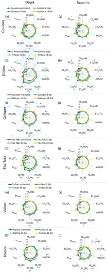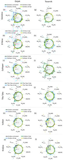 Changes in JIP-test parameters in flag leaves after inoculation with F. graminearum + F. culmorum for each variety separately at location Tovarnik are presented in Figure 3g–l. At location Tovarnik, similar to what was observed at location Osijek, Fusarium infection generally had a greater effect on measured JIP-test parameters in earlier phases of infection. However, for variety Galloper, none of the analyzed parameters in flag leaves at this location were affected by FHB (Figure 3i), and the only difference between treated plants and the untreated control of variety Golubica at location Tovarnik was seen in a statistically significant increase in PITOTAL at 18 dpi (Figure 3g). Changes in variety El Nino were observed at 3 dpi when ET0/ABS, ET0/TR0, PIABS, and PITOTAL were decreased and ABS/RC, TR0/RC, and DI0/RC were increased (Figure 3h). Additionally, El Nino showed a decrease of PIABS at 10 dpi (Figure 3h). Values of TR0/ABS were mostly not affected by FHB at location Tovarnik, similarly to what was observed at location Osijek. Only slight but statistically significant increase of this parameter was detected at 10 dpi in variety Tika Taka (Figure 3j). Furthermore, ET0/RC was affected at 3 and 10 dpi for this variety (Figure 3j). Variety Vulkan showed only small decrease of ET0/RC at 10 dpi (Figure 3k), while variety Kraljica had decreased values ET0/ABS and ET0/TR0 at 3 dpi, and increased values of ABS/RC, TR0/RC, and ET0/RC at 3 dpi as well as increased values of ABS/RC and TR0/RC and 10 dpi in treated, compared to corresponding inoculated plants at location Tovarnik (Figure 3l).