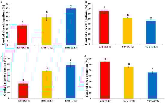 In YJY, the cooked rice elongation percentage was 65%, 52%, and 46% for the GT1, GT2, and GT3 regimes, respectively (Figure 1b). The cooked rice expansion percentage of YJY was 65%, 56%, and 46% for the GT1, GT2, and GT3 regimes, respectively (Figure 1d). According to the results, in YJY, GT1 (high-temperature regime) recorded the highest cooked rice elongation and cooked rice expansion percentage. The results of Student’s t-tests showed significant differences (p ≤ 0.05) in the cooked rice elongation and cooked rice expansion percentages among the three growth temperature regimes.