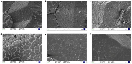 Starch granule morphology: (a) starch granule morphology of B385 grown in GT1 regime; (b) starch granule morphology of B385 grown in GT2 regime; (c) starch granule morphology of B385 grown in GT3 regime; (d) starch granule morphology of YJY grown in GT1 regime; (e) starch granule morphology of YJY grown in GT2 regime; (f) starch granule morphology of YJY grown in GT3 regime.