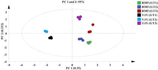 Standardized metabolic data were used to perform principal component analysis (PCA). PCA was performed using SIMCA 14.1. The graphics of the heatmap was performed with TBtools software (version no 1.09852), and data values are presented on a log scale. To assess statistical differences among GT1, GT2, and GT3 regimes, Student’s t-tests (performed using SPSS software) were conducted, with p < 0.05 used as the criterion of significance. Different lowercase letters (in the figures) indicate significant differences among the mean values.