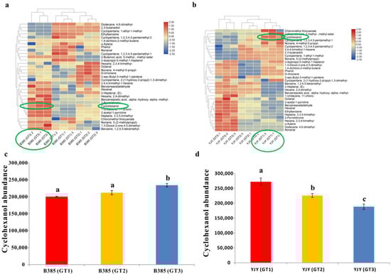 Heatmaps and cyclohexanol abundance: (a) heatmap of compounds identified in B385 grown in GT1, GT2, and GT3 regimes; (b) heatmap of compounds identified in YJY grown in GT1, GT2, and GT3 regimes; (c) cyclohexanol abundance in B385; (d) cyclohexanol abundance in YJY. Different lowercase letters indicate significant differences (p < 0.05) among the mean values.