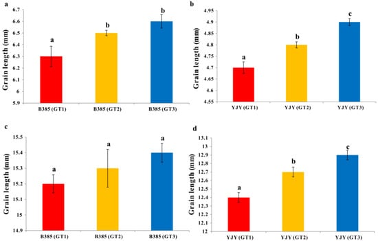 The results of Student’s t-tests showed significant differences (p ≤ 0.05) in the grain length and perimeter of YJY; however, in B385, only the length in GT1 was significantly different, whereas the perimeter results did not show a significant difference.