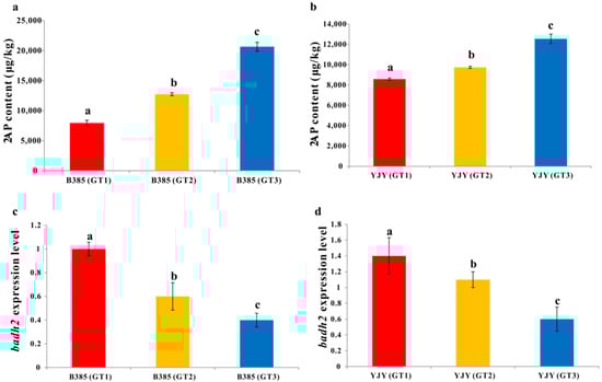 Lastly, we also investigated the effect of temperature on 2-AP, the major compound associated with fragrance in rice. Our results showed that, in both B385 and YJY, grains harvested from rice plants grown in GT3 had the highest content of 2-AP, whereas grains harvested from rice plants grown in GT1 had the lowest content of 2-AP (Figure 6a,b).The badh2 gene is responsible for fragrance in rice [,,,]. We also discovered that, in both B385 and YJY, grains harvested from rice plants grown in the GT3 regime had the lowest expression of badh2, whereas grains harvested from rice plants grown in the GT1 regime had the highest expression levels of badh2 (Figure 6c,d). These findings are in agreement with Hinge et al. [] who reported that a negative expression of badh2 is associated with the biosynthesis of 2-AP in fragrant rice. Our results showed that low temperature increased the biosynthesis of 2-AP in both indica and japonica rice cultivars.