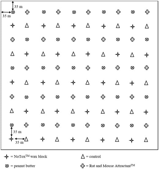 - Burke, C.B.; Quinn, N.M.; Stapp, P. Use of rodenticide bait stations by commensal rodents at the urban-wildland interface: Insights for management to reduce nontarget exposure. Pest. Manag. Sci. 2021, 77, 3126–3134. [Google Scholar] [CrossRef] [PubMed]