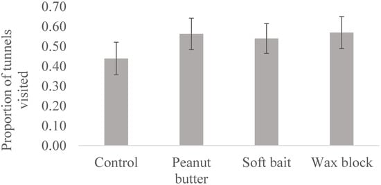 The mean proportion of tracking tunnels that were visited by roof rats that were baited with peanut butter, Rat and Mouse AttractantTM soft bait, NoToxTM wax blocks, or that served as a control (i.e., no bait applied) within six citrus orchards in the southern San Joaquin Valley, California, during winter through early spring 2020–2021. Standard error bars are also provided.