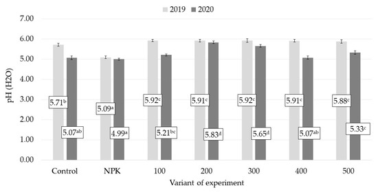 The pH values in all the combustion ash-fertilized variants did not differ significantly in 2019, whereas the highest pH values in 2020 were found in the variants fertilized with 200 and 300 kg K2O ha−1. The application of biomass combustion ashes did not increase the reaction in any experimental variant. The pH values in all the variants were higher in the first year of the experiment and decreased in the following year.