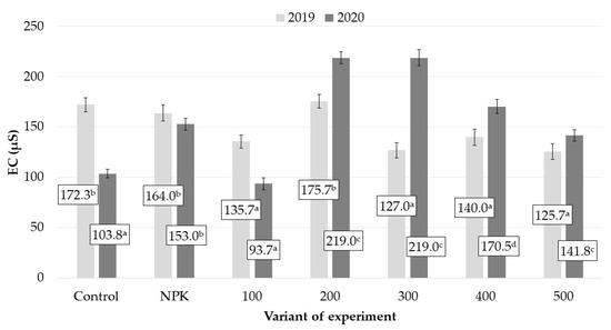 The content of various salts in soil can be determined indirectly by measuring their content in the soil solution based on ionic conductivity, known as electrolytic conductivity (EC). The increase in salinity in the analyzed podzolic soil was induced by the application of both NPK mineral fertilization and biomass combustion ashes (Figure 2). In the first study year, the application of combustion ashes did not increase the salinity of the soil in the 0–5 cm layer. Except for the variant treated with 200 kg K2O/ha of ash, the highest EC values were recorded in the control and the NPK-fertilized variant. A different tendency was observed in the second study year, as the application of ashes at a dose of 200 kg K2O ha−1 and higher significantly increased the soil salinity value. Despite the increase in the mean EC values induced by NPK and ash fertilization, the salt concentration in the soil solution was within the range tolerated by all plant species.
