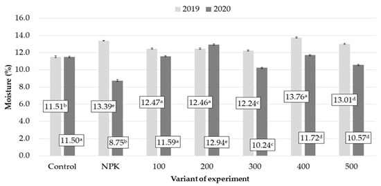 Changes in the moisture of the podzolic soil in the 0–5 cm layer after application of biomass combustion ashes (mean ± SD). Identical superscripts indicate that there are no significant (p > 0.05) differences between the experimental variants, as shown by the Tukey HSD post hoc test.