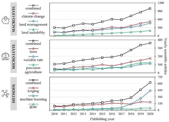 The number of scientific articles indexed in WoSCC from 2010–2020, based on the combination of terms “soil”, “interpolation”, or “prediction”, with specific terms listed.