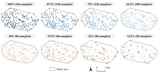 The original soil sample set was split using a geographically stratified random splitting procedure to create soil sample subsets. The stratification was performed by horizontally and vertically splitting the study area into four equal zones. Samples in each of these zones were then randomly split in eight variations according to the percentage of the original soil sample set: 100%, 87.5%, 75%, 62.5%, 50%, 37.5%, 25%, and 12.5%. After the splits within each zone, corresponding subsets containing the same percentages were merged into a study area subset covering the entire study area, forming eight subsets in total (Figure 3). This approach achieved a balanced spatial distribution of soil samples over an entire study area, which more accurately simulates the soil sampling procedure in the field than the conventional random split procedure. A similar variation of the applied method for creating soil sample subsets was successfully performed in studies by Kravchenko [11] and Rodrigues et al. [12].