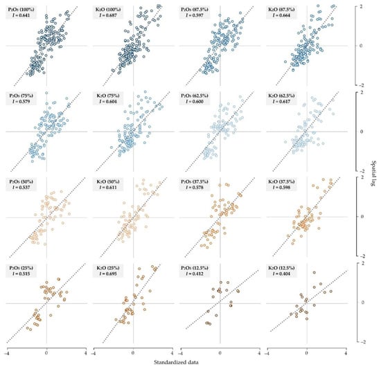 where n represents a quantity of soil samples per subset, represents spatial weight which indicates a spatial relationship of two neighboring samples, represents sampled P2O5 and K2O values, while represents the arithmetic mean of all input values per subset. Distance weights for Moran’s I were determined using the K-nearest neighbors method, based on the four neighbors of each soil sample. The optimal spatial resolution of the interpolation results relates to the number of samples per subset and was determined for each of the eight subsets using the Inspection Density method according to Formula (2) by Hengl [28]:
