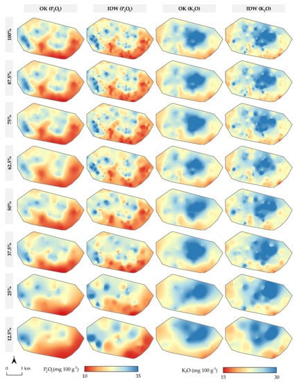 The optimal OK interpolation parameters per subset are shown in Appendix A, Table A1. The mathematical power model was determined as the best fit for all interpolation variants. Fitting autocorrelation ranges corresponded to those determined by the correlograms, increasing for 25% and 12.5% soil subsets. The highest R2v values were observed for denser soil subsets, especially for 62.5% and higher percentages of the original soil samples. Both OK and IDW achieved high spatial interpolation accuracy for subsets containing 37.5% or more of the original samples (Table 3). The P2O5 was more accurately predicted by IDW in six cases, per RMSE and NRMSE values. IDW achieved maximum interpolation accuracy for the 87.5% subset, followed by the full soil subset using the OK. Considering the R2 values for P2O5, the top two subsets produced a large gap in the results for 75%, 62.5%, 50%, and 37.5% values, while the bottom two subsets further showed a considerable decline in interpolation accuracy. OK was a more accurate interpolation method in seven of eight cases for the K2O samples, with higher spatial autocorrelation than the P2O5 values. Similar to the previous case, the most accurate interpolation variant was achieved using the 100% soil samples, with accuracy significantly dropping for the two sparsest subsets.