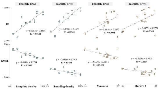 Both R2 and RMSE representing the interpolation accuracy of the combined OK and IDW results indicated a strong correlation to the sampling density (Figure 6). Sampling density resulted as a prime indicator of the interpolation accuracy, having a superior correlation with R2 and RMSE for both soil chemical properties. The spatial autocorrelation represented by Moran’s I showed a lower impact on the interpolation accuracy, with a slightly higher impact on lower spatial autocorrelation P2O5 values.