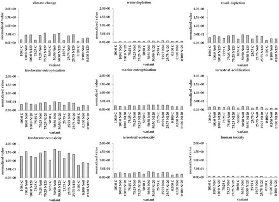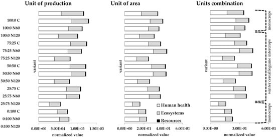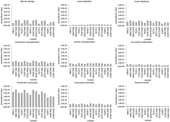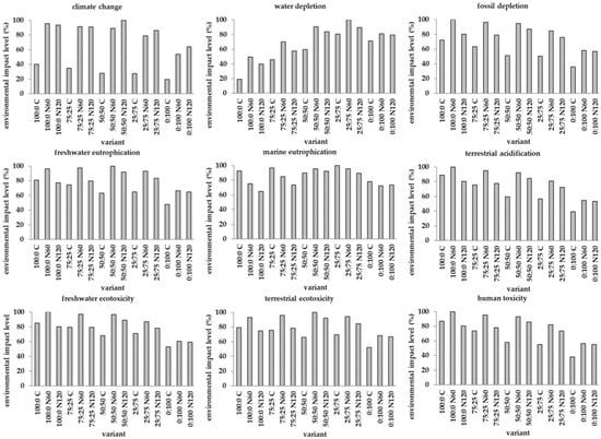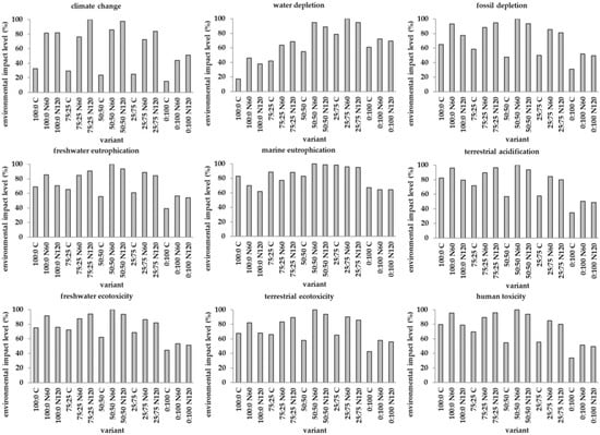 In Table 2, the grain N yield ha−1 was considered. Within all assessed variants and trends, pea monocrops had generally low values in individual impact categories. Further, low levels of environmental impact were found for the following variants: 100:0 N120, 50:50 C, or 75:25 N120. On the contrary, the highest environmental impacts were found for 100:0 N60, 75:25 N60, 50:50 N60, or 25:75 N60. This, of course, depends on the level of grain N yield and inputs to the life cycle. The input of N and thereby the related emissions were a significant component of the total environmental impacts.