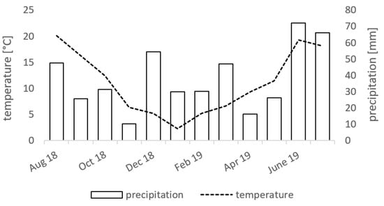Temperature (line, monthly mean) and precipitation (bars, monthly sum) at the experimental test site in Rostock within the vegetation period from August 2018 to July 2019.