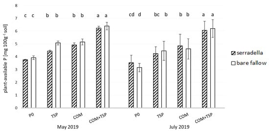 The plant-available P content in the soil was strongly influenced by the applied fertilizers and did not follow a seasonal pattern (see Figure 2, Table 2). The highest amounts of plant-available P in soil were measured on plots where the combined COM + TSP fertilization was applied with up to 6.5 mg P 100 g−1 soil. Values in the TSP and COM treatments were lower and reached only 4–5 mg P 100 g−1 soil. As expected, the control plots without fertilization had the lowest values. Interestingly, the catch crop showed an effect only at the later samplings. Here, the P-unfertilized plots with serradella pre-cropped showed higher values compared to the bare fallow subplots.