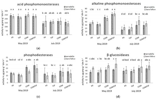 Potential soil enzyme activities of (a) acid phosphomonoesterases (ACP), (b) alkaline phosphomonoesterases (ALP), (c) phosphodiesterases (PDE) and (d) β-glucosidases (GLA) in May and July 2019 as affected by fertilization (P—no additional P; TSP—triple superphosphate; COM—compost; COM + TSP—compost + triple superphosphate) and pretreatment (with/without catch crop) at the field experiment in Rostock; post hoc test Kruskal–Wallis p < 0.05; abcd = differences between treatments and fertilization within a sampling date.