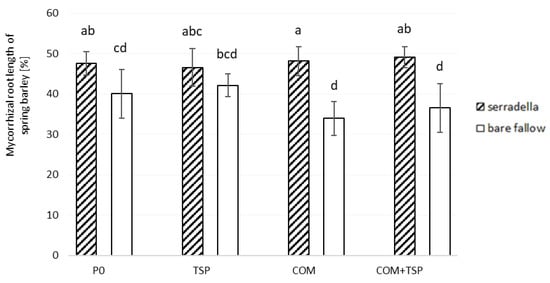 The analyses revealed that pre-cropping of serradella can promote mycorrhiza formation of subsequent grown barley compared to previous bare fallow in all treatments of fertilization (Figure 4). This confirms that the crop rotation is a significant factor in the control of mycorrhizal abundance [,,]. In the present study, the mycorrhizal colonization of barley ranged from 34 to 49% of the fine root length (see Figure 4). This is in the lower range of mycorrhizal colonization of barley observed in a study of Castillo et al. in Andosols in southern Chile (from 30 up to 80% of the fine root length) []. Although it is known that the mycorrhizal colonization of cereals, such as barley, can vary significantly [,], increased colonization is, in general, assumed to be an indicator of increased mycorrhizal dependency of the host plant []. Consequently, the increased mycorrhizal dependency of barley after serradella cropping confirms our hypothesis that catch crops promote the growth of AM fungi, even in response to a non-host plant (serradella). This is in line with results of Poveda et al. [], who found mycorrhiza formation even on non-host plants (Brassicaceae) under favorable rhizosphere conditions. Furthermore, a meta-analysis of seven studies with 60 observations on different catch crop types indicated the potential of catch crops for mycorrhiza formation []. Our results specified this for the first time for the cropping of barley after serradella.