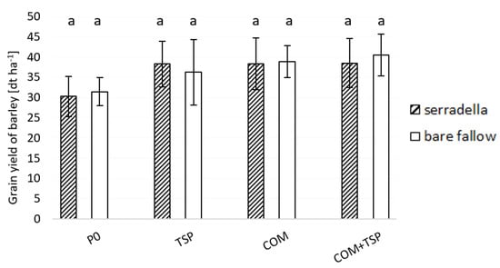 Grain yield of spring barley (dt ha−1) in August 2019 affected by fertilization (P0—no additional P; TSP—triple superphosphate; COM—compost; COM + TSP—compost + triple superphosphate) and with/without serradella as previous crop; post hoc Tukey HSD p < 0.05; a = no differences between treatments and fertilization.
