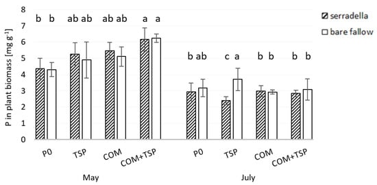 Phosphorus in aboveground biomass (mg g−1) of spring barley (BBCH 33 and 69) affected by different fertilization treatments (P0—no additional P; TSP—triple superphosphate; COM—compost; COM + TSP—compost + triple superphosphate) and with/without serradella as pre-crop in May and July 2019 at the test site of Rostock; post hoc Tukey HSD p < 0.05; abc = differences between treatments and fertilization within the sampling date.