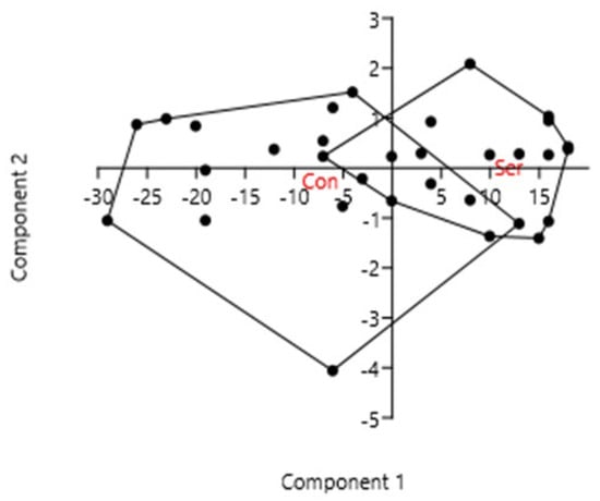 Principal component analysis (PCA) of plant properties (C:N ratio, P in plant biomass and mycorrhizal colonization) as affected by pretreatment (with catch crop—Ser; without catch crop—Con) in the field experiment in Rostock.