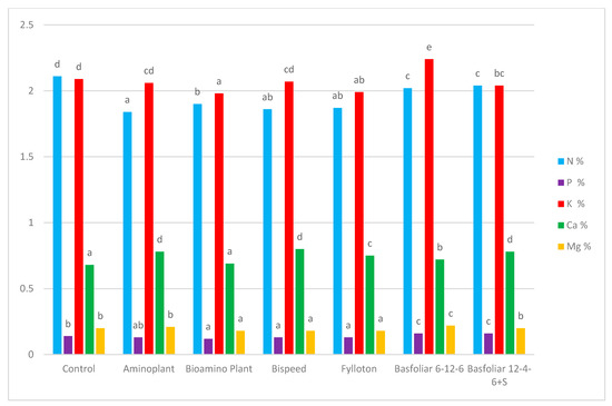 A comparison of the contents of macronutrients in the leaves of maiden apple trees depending on the applied foliar treatment. Data followed by the same letters do not differ significantly at p = 0.05 for each macronutrient according to Tukey’s test.