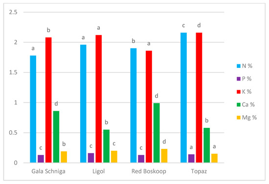 A comparison of the contents of macronutrients in the leaves of maiden apple trees depending on the variety used. Data followed by the same letters do not differ significantly at p = 0.05 for each macronutrient according to Tukey’s test.